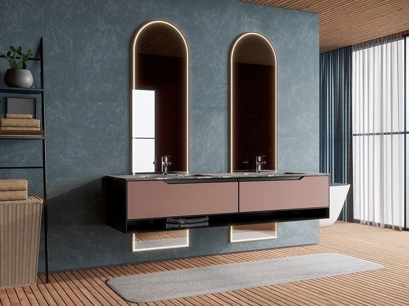 Deze badmeubel wordt gepresenteerd als een ontwerpgestuurd systeem in plaats van een generieke SKU. Het maakt gebruik van een gecontroleerd kleurenpalet, samen met een premium roestvrijstalen kaststructuur, om een meer afgeronde visuele identiteit te creëren voor premium residentiële projecten.