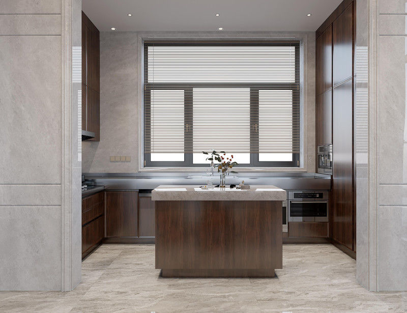 | V: Waarom combineert deze aanpasbare U-vormige keukenkast met kwarts aanrechtblad een houtnerfafwerking met een roestvrijstalen structuur? De waarde is dat de houtnerfafwerking het project een warmere, meer residentiële visuele identiteit geeft, terwijl de roestvrijstalen kaststructuur het kastensysteem gemakkelijk te onderhouden en geloofwaardiger maakt voor langdurig gebruik. |