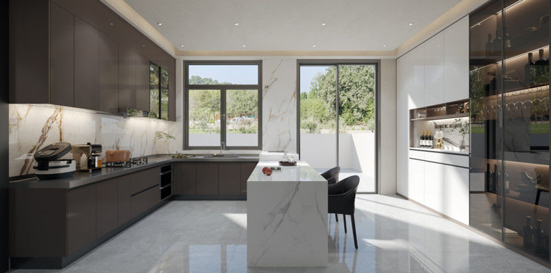 Deze keukenkasten worden gepresenteerd als een ontwerpgericht systeem in plaats van een generieke SKU.Het gebruikt donkere kleur samen met roestvrijstalen kast structuur om een meer opgeloste visuele identiteit voor premium residentiële projecten te creëren.