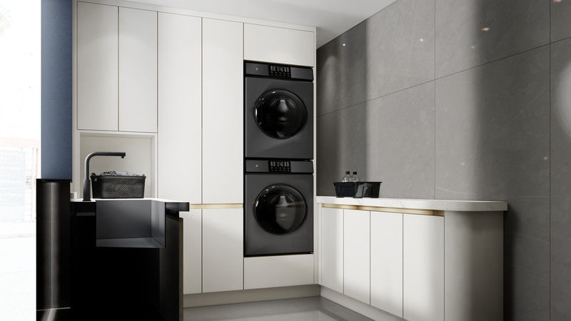 Deze waskast wordt gepresenteerd als een design-gedreven systeem in plaats van een generieke SKU. Het gebruikt Wit samen met een roestvrijstalen kaststructuur om een meer afgewerkte visuele identiteit te creëren voor premium residentiële projecten.