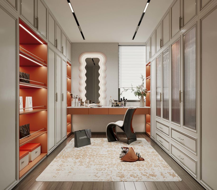Deze kledingkast wordt gepresenteerd als een ontwerpgestuurd systeem in plaats van een generieke SKU. Het gebruikt Wit samen met een roestvrijstalen kaststructuur om een meer afgeronde visuele identiteit te creëren voor premium residentiële projecten.