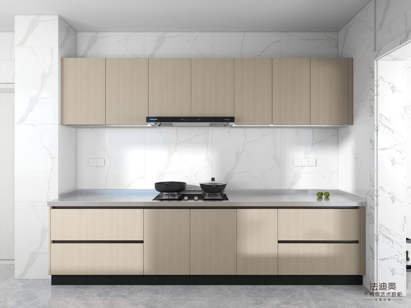 Deze keukenkast is gebouwd op basis van een gedifferentieerde afwerkingsstrategie: houtkorrels in combinatie met Premium roestvrijstalen kaststructuur.Deze combinatie geeft kopers een warmere luxe uitdrukking zonder de schoonmaakbaarheid en duurzaamheid van het project te verliezen die van roestvrijstalen kasten wordt verwacht.