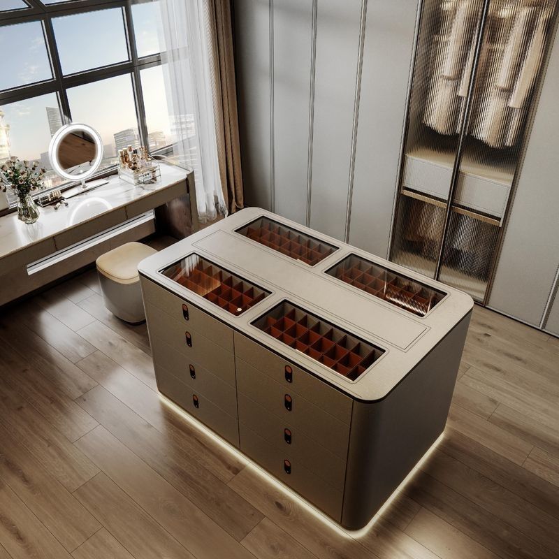 | Oostwaartslag | Centrale glazen eiland met gesegmenteerde compartimenten voor sieraden, horloges en accessoires |