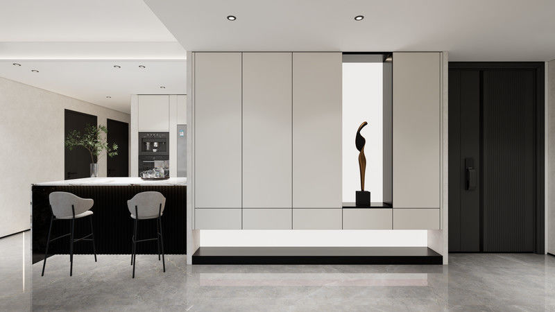 | Kleurschema | Witte deurpanelen, een zwarte ingebouwde basis, en een warme, verlichte achtergrond |