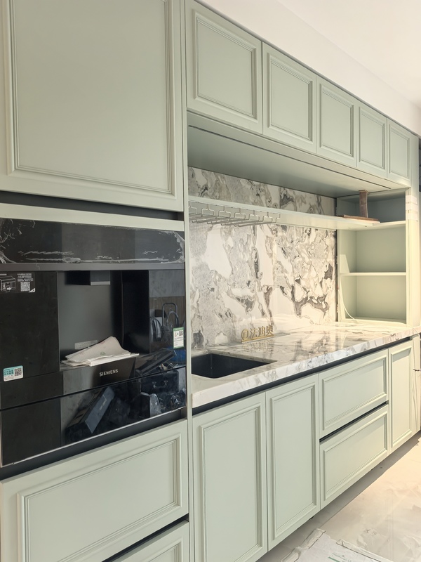 Deze keukenkast wordt gepresenteerd als een ontwerpgericht systeem in plaats van een generieke SKU. Het gebruikt Beige / Groen samen met een roestvrijstalen kaststructuur om een meer afgeronde visuele identiteit te creëren voor premium residentiële projecten.