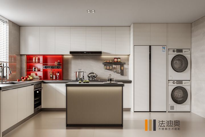 Deze keukenkasten worden gepresenteerd als een ontwerpgericht systeem in plaats van een generieke SKU.Het gebruikt wit samen met roestvrijstalen kast structuur om een meer opgeloste visuele identiteit voor premium residentiële projecten te creëren.