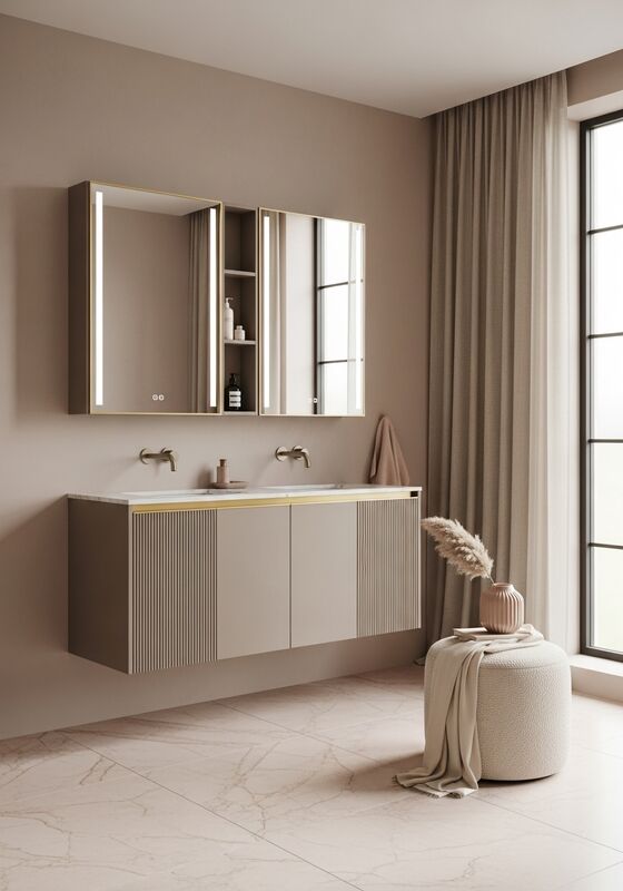 Fadior positions this bathroom vanity cabinet as a project-grade solution built around 304 food-grade stainless steel with matte taupe powder-coat lacquer finish, pvd-coated champagne gold stainless steel frame reveals, steel-based wardrobe panels with matte taupe lacquer finish, and a honed marble or sintered stone top for master ensuite, guest bathroom, powder room in luxury residential; spa-like hospitality environments; designer-specified wellness spaces. This specification focuses on Vertical micro-fluted taupe lacquer panels at 15mm pitch creating subtle shadow rhythm, PVD-coated champagne gold stainless steel frame reveals with satin 5mm width detailing so designers, dealers, and project buyers can evaluate fit, finish, and delivery logic with less guesswork.