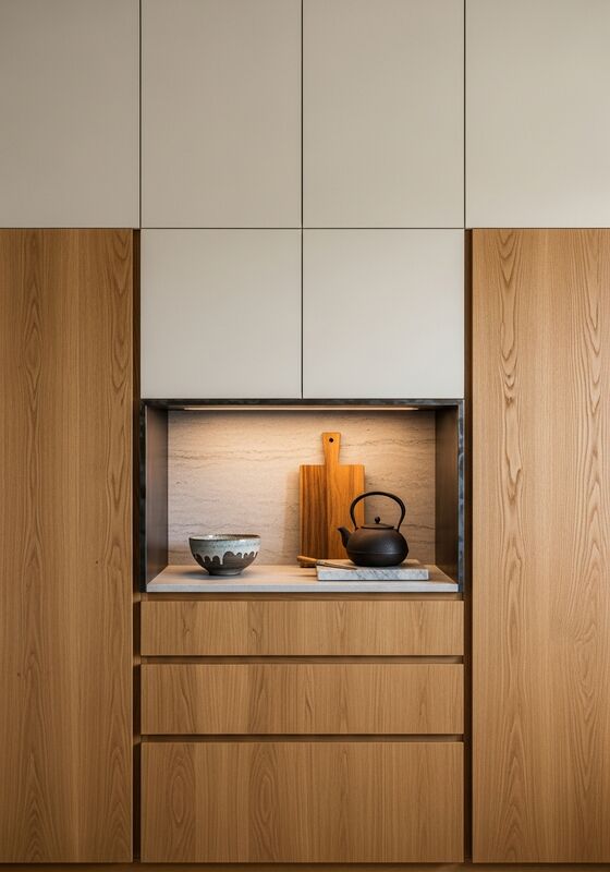 Japandi-minimalisme met wabi-sabi-ondertonen: strakke lijnen verzacht door materiaalwarmte, zichtbar |